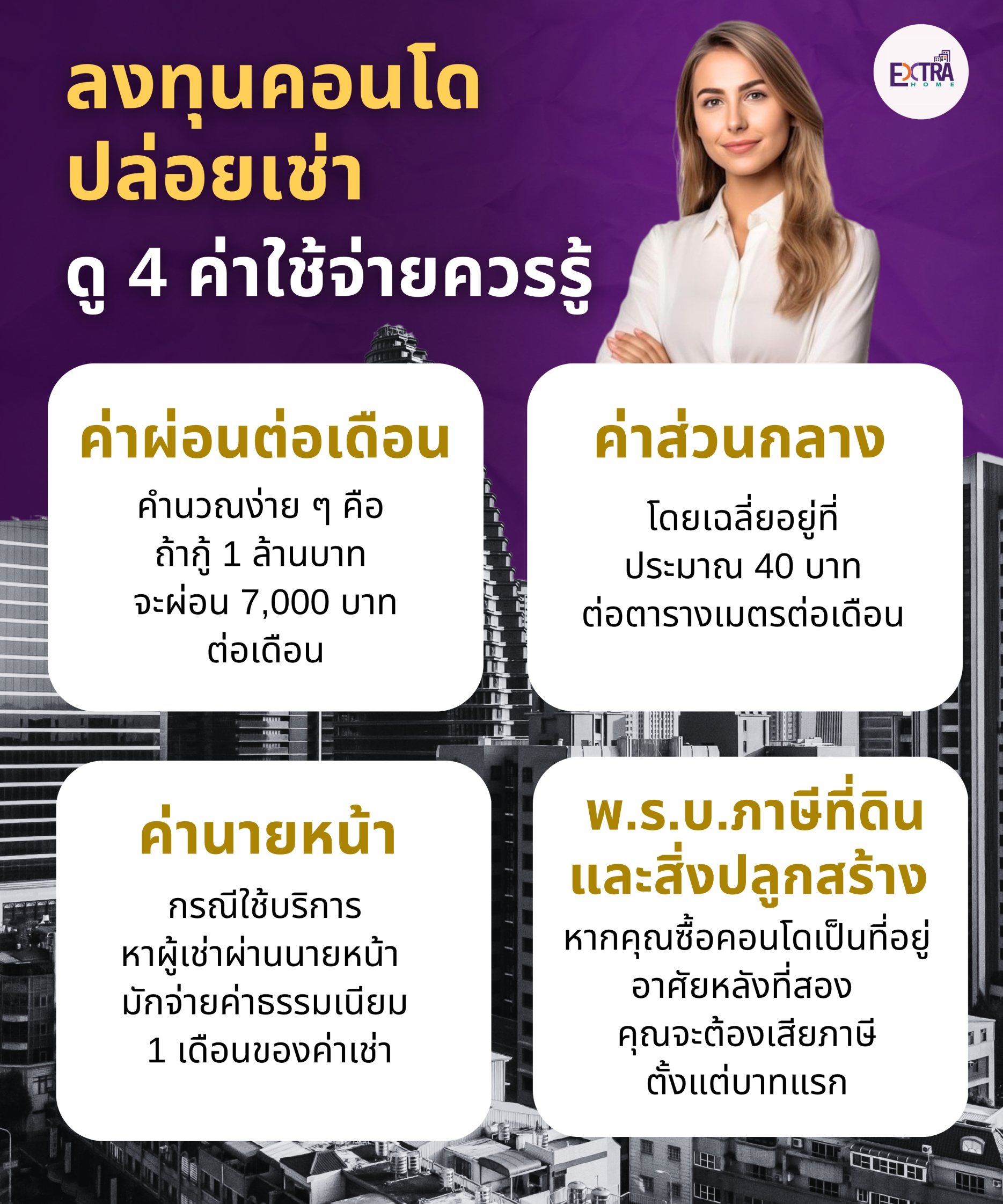 ค่าใช้จ่ายอื่น ๆ ในการโอนกรรมสิทธิ์ เช่น ค่าธรรมเนียมในการโอน 2% ค่าจดจำนอง 1% ภาษีเงินได้จากการมีรายได้ในการให้เช่า